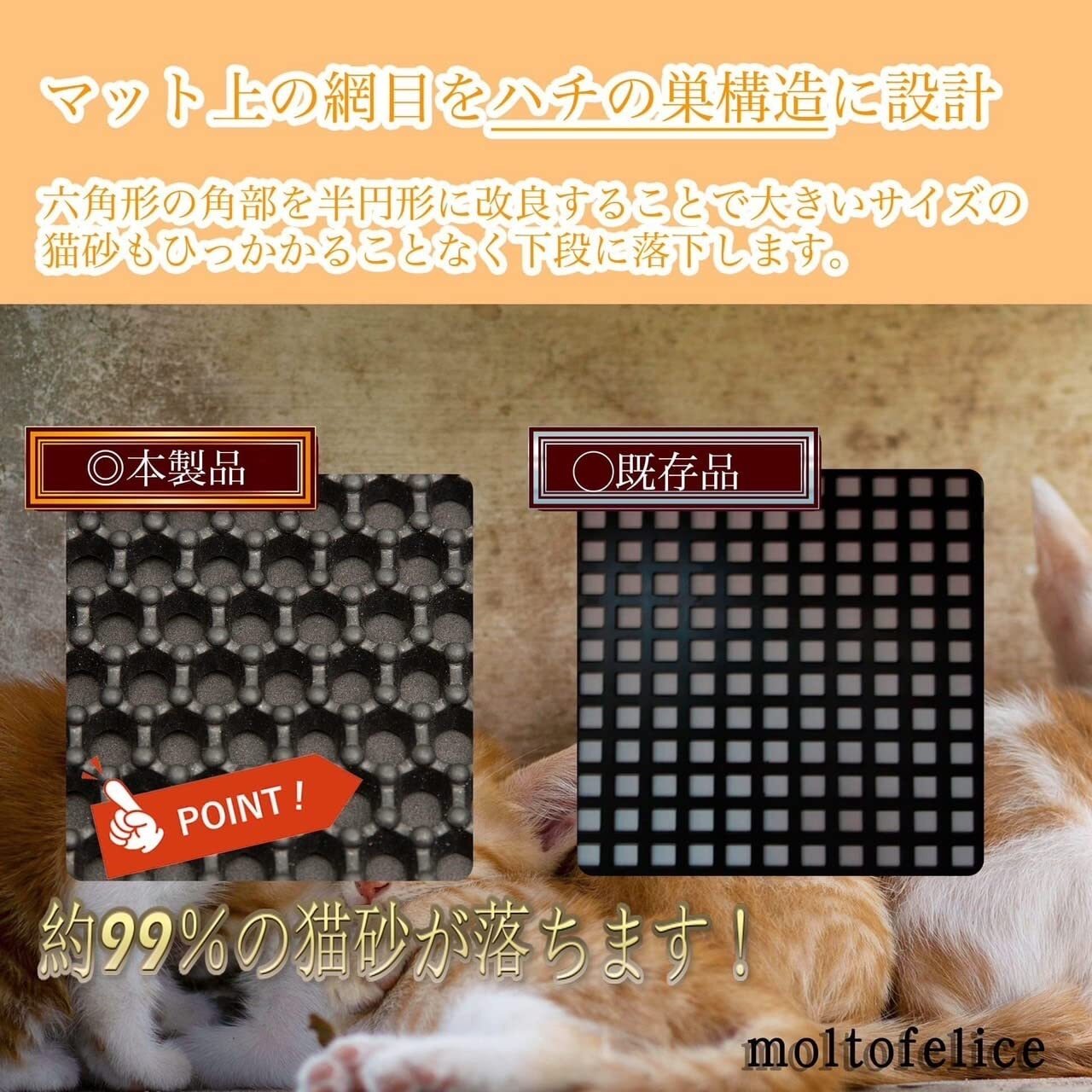【大きい直径の設計 & 隠蔵式二重構造】:大きい直径の設計は、数多くの猫砂に適用です。砂が落ちると、凹凸の表面につかまれ、あちこちにならないように清潔な室内環境を保ち続けます。同時、穴の大きさが均一で、猫ちゃんの足が引っかかりません。二層構造は、中間層に落ちたゴミを更にロックし、バラバラしている猫砂を集めて、猫トイレの掃除も簡単にできます。