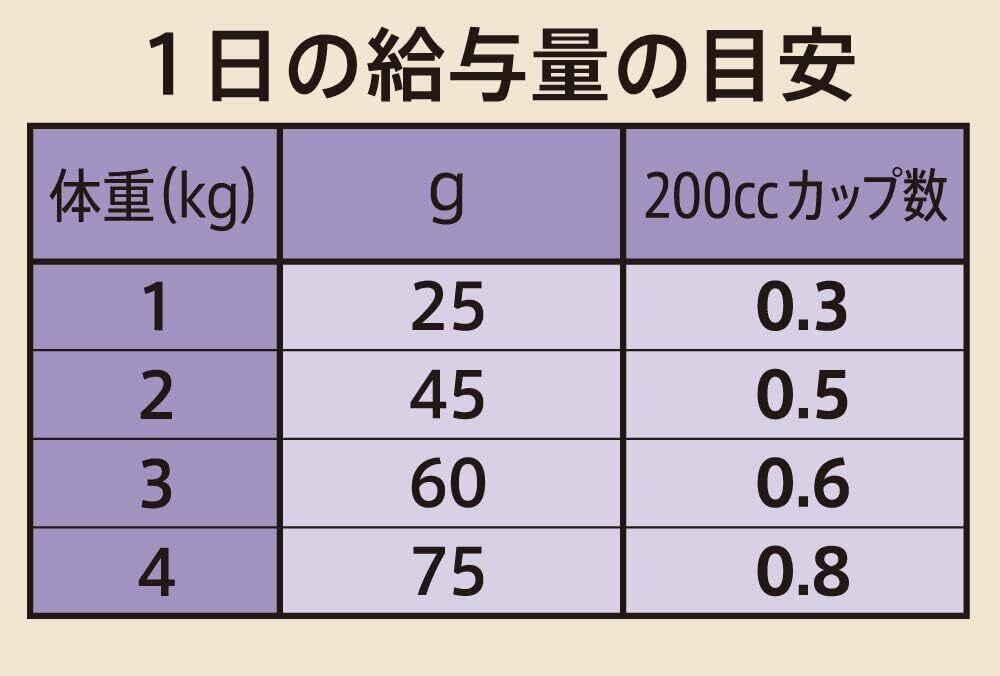 【給与量】1日の給与量の目安 体重 1kg:25g(200㏄カップ0.3)、2kg:45g(200㏄カップ0.5)、3kg:60g(200㏄カップ0.6)、4kg:75g(200㏄カップ0.8)