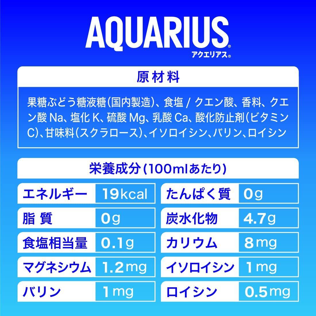 原材料・成分:果糖ぶどう糖液糖(国内製造)、食塩/クエン酸、香料、クエン酸Na、塩化K、硫酸Mg、乳酸Ca、酸化防止剤(ビタミンC)、甘味料(スクラロース)、イソロイシン、バリン、ロイシン