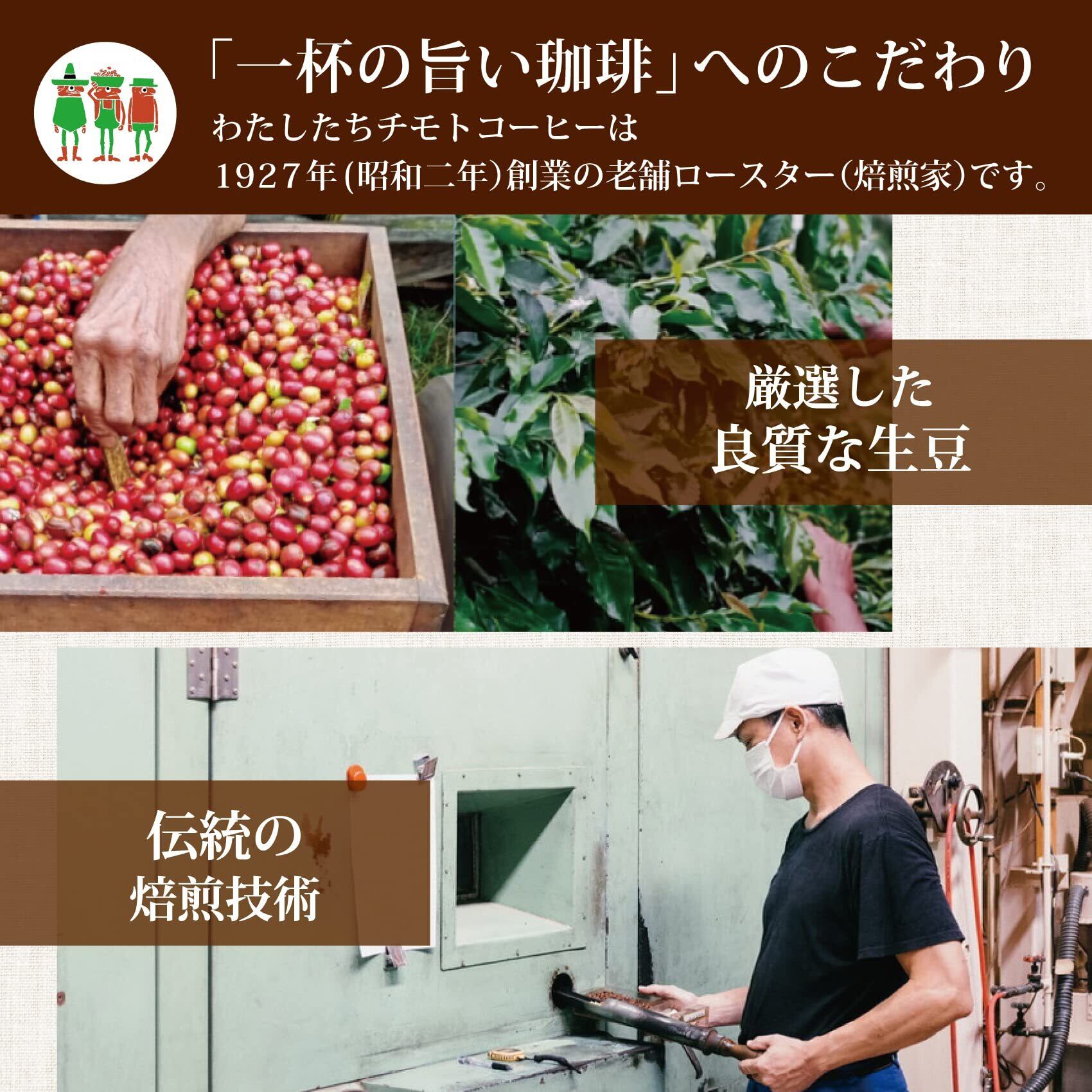 【チモトコーヒーのご紹介】世界の農園に足を運び、生産者と触れ合い、厳選した良質なコーヒー豆。培った焙煎技術と徹底した品質管理で、創業1927年から「美味しいコーヒー」を追求し、たくさんのお客様に味わっていただく事を使命と考えています。