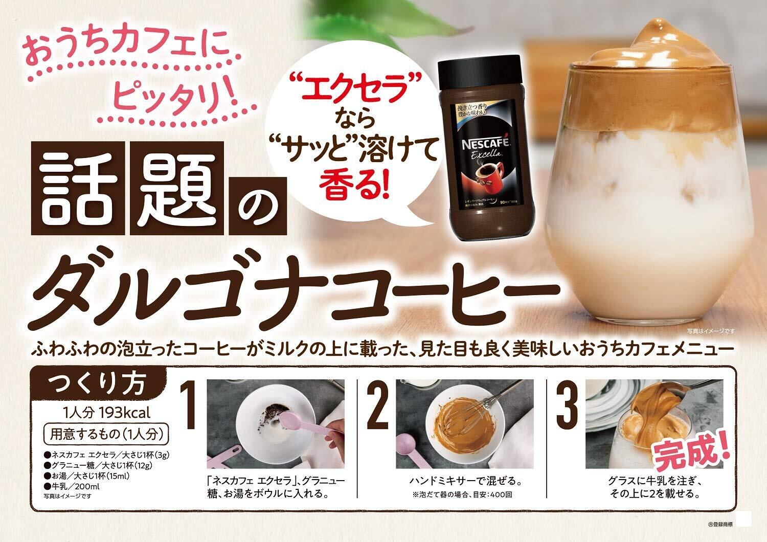 ネスカフェ エクセラはブレンドしたコーヒー豆ごとに温度・時間で丁寧に手間ひまかけて焙煎する「こまやか焙煎」と、微粉砕したコーヒー豆の粒を包み込むネスカフェ独自の「挽き豆包み製法」を採用。